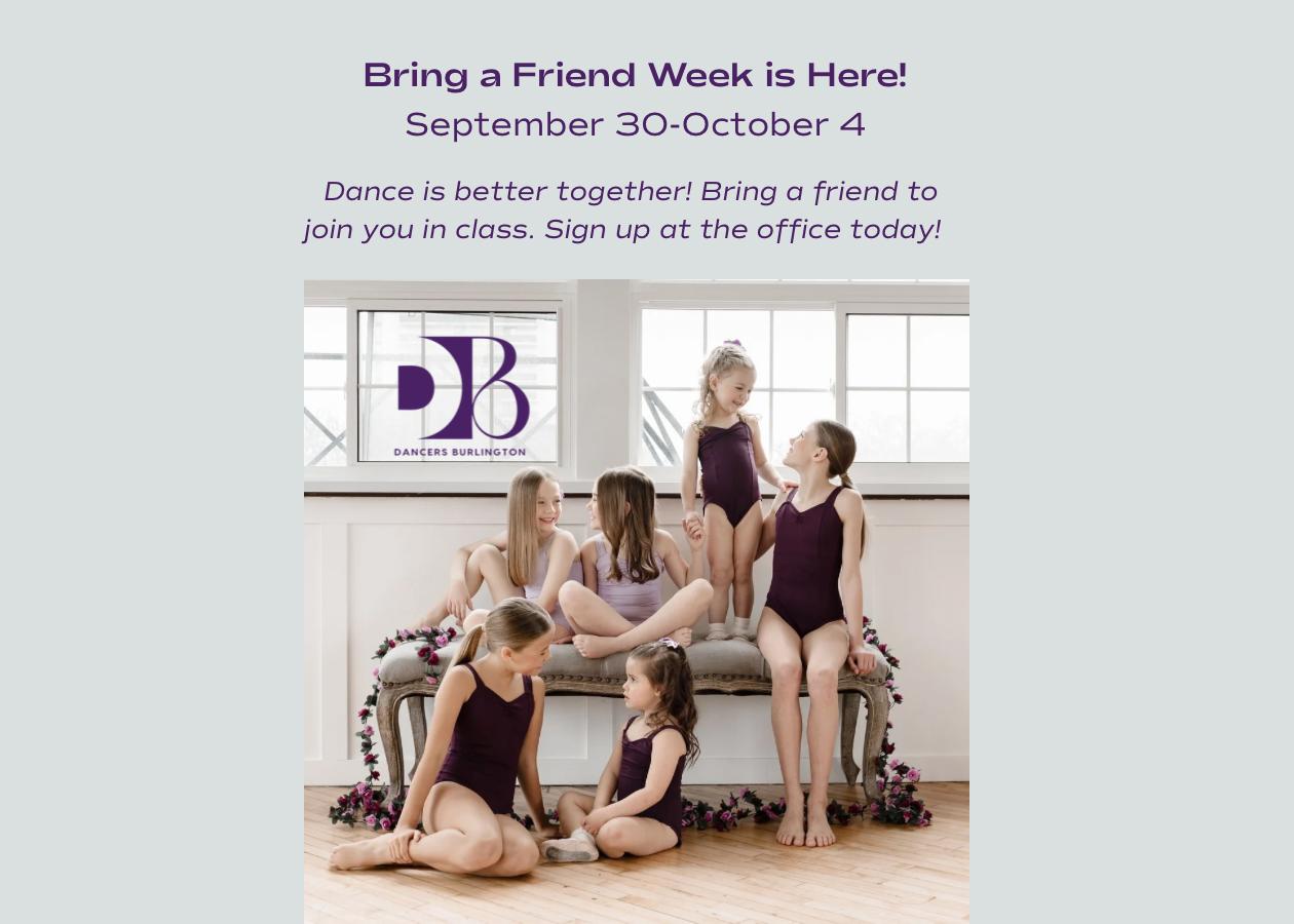 Recreational dancers (excluding Petite Ballet) can invite friends to join the fun on Tues Sept 30, Thurs Oct 2 & Sat Oct 4!